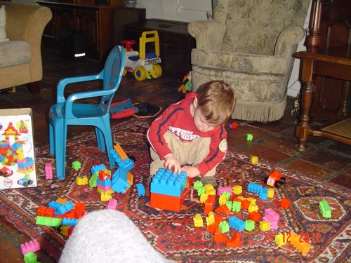 Tv aan, Mickey Mouse komt zo, "mikke muis kont" en Bart gaat alvast op schoot zitten. Wil je niet in je stoel kijken? "nee", dus we kijken even laatste stuk beer in het blauwe huis en dan komt "Mikke muis!!". Bart kijkt 10 min. en gaat dan "timme", weer even kijken en dan verder met z'n duploblokken.