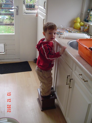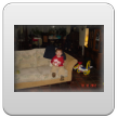 Ik hoor Bart hoesten en ga kijken, Bart ligt nog te doezelen, maar het is nu wel tijd. Ben je wakker? "Bart sape", maar ben je nu wakker? "Jaaa". Dan procedure in omgekeerde volgorde: "saapsak uit, jama uit, bote bene, boek aan, sokke aan, soene aan, gavesien kijke (op vensterbank), kippe, safoto lijle, nee, bome, koud buite", etc. We gaan naar beneden en ik warm de rest fruithap uit de ijskast op. Pak de liga's maar, weet hij ook weer feilloos te vinden. Bart zit net in z'n stoel en dan: "PAPA" die voor het raam staat. Bart kletst en kletst, wil geen fruithap, wel "koek ete, uit uit" en met z'n liga uit de stoel. We gaan op de bank "boek lese", Bart leest voor en kletst. Dan gaat papa de kerstster ophangen: "papa nou? papa ladde" (waar heeft hij dat woord nou weer vandaan???). Dan inpakken.