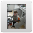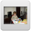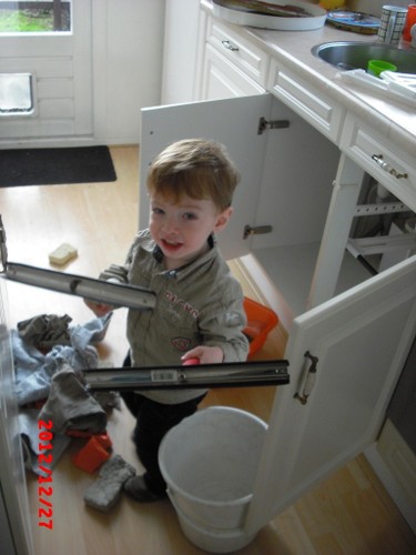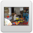 Bart begint ineens te huilen, zit een tijdje op schoot tegen m'n schouder en wordt weer rustig. Nog een zuchtje en dan: "siek uit, mikkie muis kijke". Wil je dat? "JAA!" Ik stop de dvd in de speler, Bart staat er met z'n neus bovenop, gaat dan op de bank klaarzitten voor de voorstelling. "Mikkie muis, donald duk, zeep, keurkijtjes, bokke, muis-doe-ding", kletst mee met de film en drinkt tussendoor z'n beker leeg. Afgelopen: "nieuwe mikkie muis", nee strakjes misschien, "dinke op, nieuwe hale". Naar de keuken dus en gelijk boterham smeren, die eet Bart zelf achter elkaar op, niet proppen!, ook "toet op, appew", fruithap ½ en nog een beetje drinken. Ondertussen meldt Bart wat er allemaal voorbij rijdt op de weg. Dan ga ik opruimen, Bart gaat nog even spelen met "safoto", ik doe voor hoe je blokjes eruit kunt kiepen: "bokke in, kiepe, hoppekee, meer bokke, kiepe, hoppa".