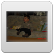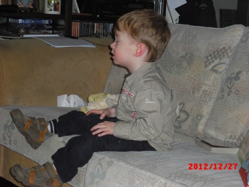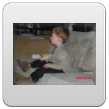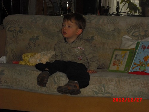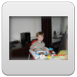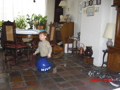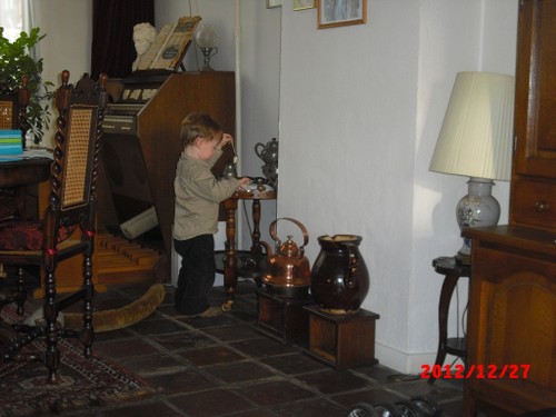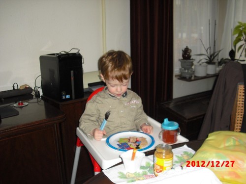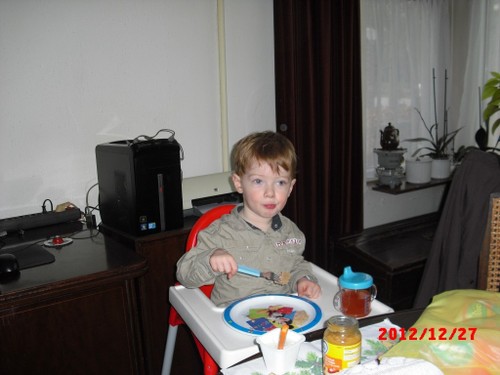 Ik ga maar eens kijken, Bart ligt lekker te dommelen, maar als hij me ziet, gaat hij direct zitten en staan en begint: "poes bofe, poes miauw". Dan aankleden onder gebruikelijke commando's van Bart; even op de vensterbank naar buiten kijken: "gavesien, hege buite, koud, kippe nee". Naar beneden, welke koek wil je? Bart pakt de ligadoos: "dese koek" en in z'n stoel eet hij de rest fruithap en begint aan z'n liga, "op, meeg koek", nog een liga? "ja berekoek". Wil je er uit? "Nee!" en terwijl Bart 1½ liga opknabbelt, keuvelen we: "oto's, safoto nee, boot". Ik zie geen boot, "JA boot", ik pak m'n bril: ik zie geen boot, maak je een grapje? Bart grijnst en dan: "lampe aan, donke buite, (ja bijna), die lamp aan (straks als het helemaal donker is), keslamp aan, kesboom lampes aan". Dan bespreken we foto's. "Oma pakke, (baby Bart), oma die pakke" (baby papa), de 2 foto's staan voor z'n neus op tafel en worden uitgebreid besproken. Gek hè, papa was vroeger ook baby, "JAAA, bebie Bart, bebie papa". Volgende onderwerp: "kaase op, oma nieuwe kope"; nee oma heeft genoeg kaarsen, zullen we er straks nieuwe in doen? "JA, op uit". Liga op en dan zie ik de auto: daar zijn papa en oom Bart weer, kijk maar naar het balkon. "Papa! oom Bart?" ja die is er ook, kijk maar.