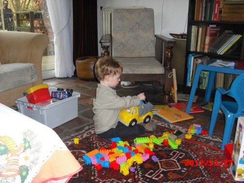 Dan wordt de "ballon" (bal) tevoorschijn gesjord en Bart gaat ermee gooien en erop zitten. Verder met kleurpotloden "sijve", dese niet, dese niet" (bepaalde tekenbladen zijn blijkbaar niet goed genoeg), mikkie muis kijke, soeke, soeke, dese (hij gluurt op de dvd-plank, strakjes gaan we mikkie muis kijken), boek pakke". Eerst wordt het dierenboek op m'n schoot gemikt: "lese", we lezen samen op de bank, "uit, anne boek", een hele rits boeken belandt uit de kast op de grond totdat meneertje het goede boek heeft gevonden: "lese, lettes, uit, anne boek, lese". Tussendoor eet ik een boterham: "omadien ete, soepies ete (oei! nee dat zijn geen snoepjes, dat zijn vieze pillen, bah), Bart kijkt me peinzend aan en we lezen verder. "Uit", genoeg gelezen en Bart speelt verder: "safoto (graafauto), bokke, papa dinke op, op zijn".