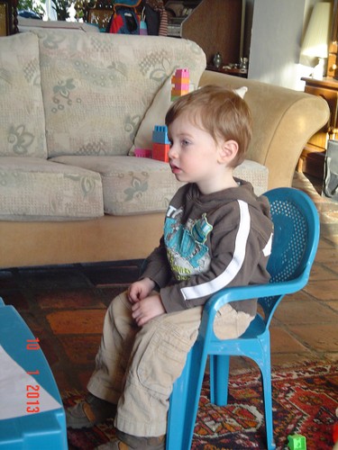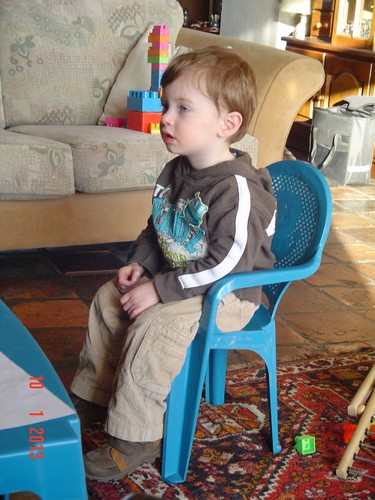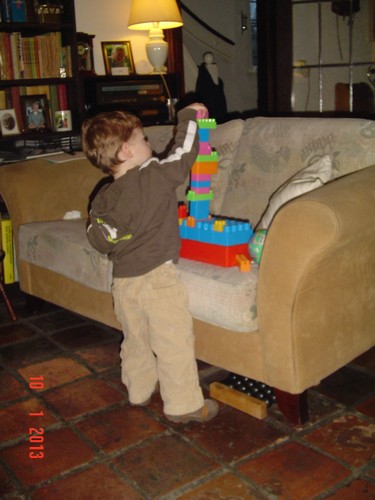 Door mama op de fiets gebracht, koude handen en gelijk kletsen: "tekke, tekke kijke, safoto boem, tekke niet sien". Even voor het raam staan terwijl ik een handje opwarm, "dese ook", 2 handjes dus. Mama zwaaien en dan aan de slag met lego: "towe bouwe, siek aan, nieuwe blokkes pakke, (kiept doos om) blokkes mee, heel mooie maakt, anne blokkes, tee blokkes, bofe opsette, hiebewt, anne blokkie, blokkies valle." Is er een hele tijd mee bezig tot de zaak instort.