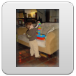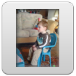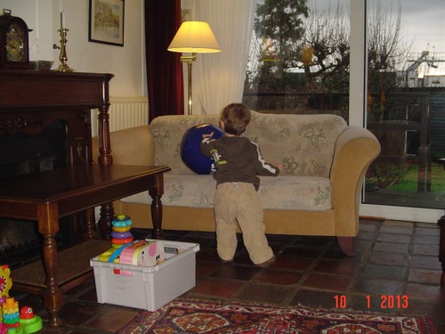 We zijn weer in de kamer en Bart zit naast me op de bank een koekje te eten en kwijlt: "Bart koeie", ik veeg het af en meneertje vindt dat een leuk spelletje want hij produceert steeds een nieuwe spuugbel en laat die langs z'n kin lopen. Ga nog maar even drinken dan gaan we naar de zolder. Ha! iets nieuws, Bart is afgeleid van z'n bellen en neemt een paar slokken sap.