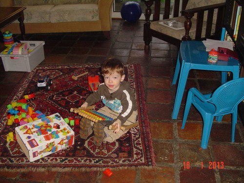 "Blokkes in oto", rijdt op z'n loopwagen naar de keuken, "dinke, koek pakke, nee, dese koek, dese nijn" (nijntjekoekjes). In de kamer koekje eten, lego spelen, kletsen, kletsen, nog een koekje. "Bal, Bart sooie, pakke, noggekeeg (koppen), noggekeeg, timme". Dan even kleurpotloden en krijtjes inventariseren en tellen op telraam: "een, tee, die, fijf, ses, hood".