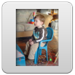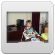 Meneertje is al 5 min. aan het kletsen; als ik binnenkom zit hij rechtop en zegt "hai!" Aankleden en even op de vensterbank staan: "tekke, motosaag nee, meer in bak inneniet, safoto". In de keuken eet Bart een plakje worst terwijl de fruithap beetje opwarmt. Bart kijkt al etend naar buiten. "Bart dinke, (waar is je beker?) beke in kameg, (ga maar halen, heb je hem gevonden?) JAAA, lekke". Komt al drinkend de keuken in. Aan tafel eerst beker verder leegdrinken dan rest fruithap op en ondertussen doet Bart verslag van het verkeer: "mawisie-oto, safoto, vuiwisoto (was dat een vuilnisauto?) JAAA", nou-nou en dat allemaal achter elkaar, dat was boffen hè? "JAAA, mawisie-oto, vuiwisoto". Wil verder geen banaan of liga maar gaat verder spelen. "Bart boek pakke, boek lese, bank sitte". Samen lezen we even dierenboek. Dan: "oma toe sitte, baw pakke". Ik moet in de stoel en krijg de bal in m'n handen, wil je koppen? "JAAA". Dat spelen we een tijdje, Bart schatert en haalt iedere keer de bal weer op. Als hij er genoeg van heeft, gaat hij met krijtjes en kleurpotloden en de doosjes aan de slag: "kijtje in, allebei in, dis, ope, pen in, dis". Als hij langs komt lopen, ruik ik iets; heb je poepiebroek? "Nee", laat oma maar even kijken, "NEE" en Bart pakt z'n tekenblok: "boekie lese, niks in". We gaan toch maar even schone luier aan doen, kom maar, "boek mee", goed hoor, en Bart ligt op het kussen te worstelen met z'n tekenblok, 1 blaadje raakt los: "oma make", gaat niet mannetje, los is los. Klaar, even buiten kijken boven op de tafel.