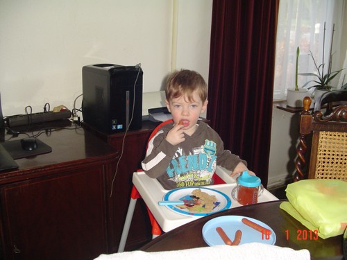 Mikkie muis afgelopen, brood maken! Eerst de worstjes opwarmen, ik laat ze Bart zien als ik ze in de pan heb gedaan: "lekke". Aan tafel eet Bart er 7 samen met een boterham, dan toet en ½ fruithap. Ondertussen worden foto's besproken: "papa, mama, tante Hoos, tante Debi, meer in boot". Nee da's niet een meneer, da's papa met oom Bart, kijk maar. Bart bestudeert de foto voor z'n neus en kijkt me aan, ja da's papa in een boot, Bart kijkt nog eens, hij vindt het maar raar en kijkt vergelijkend naar de andere foto. Ik wijs nog een keer en dan wijst hij "papa, oom Bart" aan. Ze zien er ook wel een beetje raar uit in overalls en laarzen.