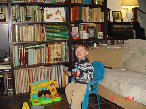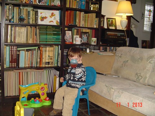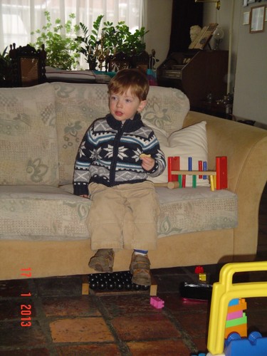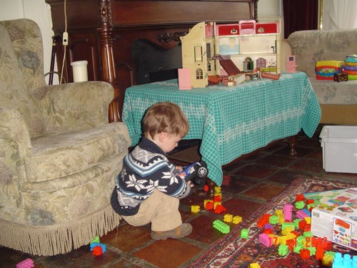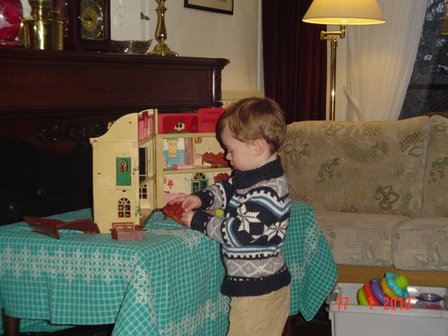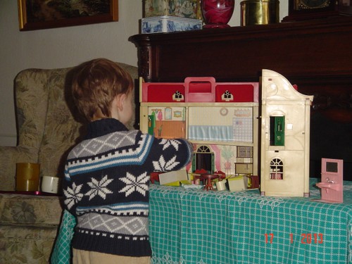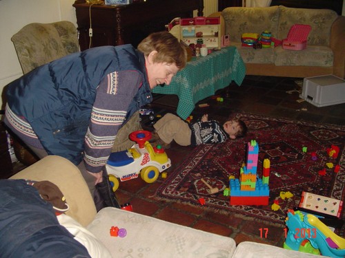 Ik moet hem wakker maken, maar in de vensterbank kletst hij er weer lustig op los. Daarna rest fruithap op, wil geen liga en wil niet drinken. Spelen lego: "same towe bouwe", maar al gauw weer naar het poppenhuis. "Pas niet, jammeg" (probeert legoblokjes in de pietepeuterige kastjes te stoppen), popje doese (zet hem onder de douche en doet alsof hij er water bij giet), popje sitte, anne popje". Oma zal volgende keer meer popjes pakken. "Bart mee solde, popjes hale".