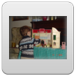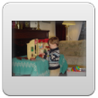 "Oom Bart kame, oma pakke (knikt met z'n hoofd), bofe. Tafe, kas, oma ope doen, pas doen (pakt wc-tje) nogge kas" (dat was het poppenhuis). Mikkie mous kijke (pakt dvd - nee strakjes), kaks, boeke lese hondeboek (zoekt boekje in de boekenkast). Blokkes pakke, oma kaffe (kachel) aan doet, kik aan. Blokkes in safoto, kiepe, efe opkille, hooie, ook kiepe, nieuw pakke, opkille (legodoos) waag (zwaar), blokkes sond. Duive kijke buite, ladde kapot (trapje van poppenhuis), oma make (ja straks).