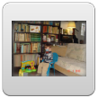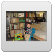 Blokkes onne bank (pak maar), kannie bij (ga je bezem maar halen, komt met bezem en fietspomp uit de keuken en port onder de bank). Da blokkes!" Bart loopt van speelgoed naar speelgoed, beetje onrustig.
