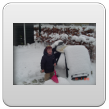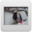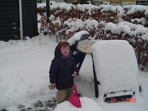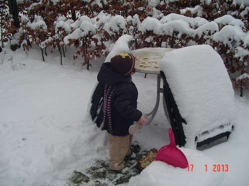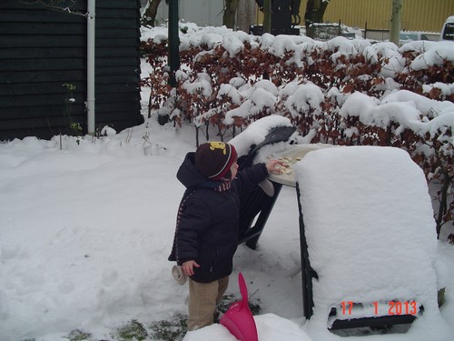 Naar de keuken, laarzen, jas en muts aan, brood mee en de tuin in om vogels eten te geven via schoongeveegde paadje. Daarbuiten kan Bart niet lopen, sneeuw komt tot boven z'n laarzen. Eerst in vogelhuisje "same doen", nee kan je niet bij, "oma opkille", ook nee, veel te bang dat we vallen in de gladde sneeuw. Dan naar de tuintafel, daar kan Bart wel bij en legt 1 voor 1 brokjes erop: "fofes boteham ete, happe". Op de terug weg stapt Bart in een sneeuwhoop en valt met z'n handen in de koude troep, protest: "hanne koud", de lol is er af dus gauw naar binnen.