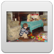 In de kamer: "lampe aan", nee hoeft niet, straks weer als het donker wordt. Bart is het er niet mee eens: "die aan, die aan" en wijst. Nee hoeft echt niet, maar Bart loopt vliegensvlug naar de lamp boven de houtkist en doet hem aan. Neenee, daar mag je niet aankomen, Bart trekt een pruillip en zoekt de confrontatie: "lamp aan! (nee straks), lampe aan kaks, kopt ja (en knikt heftig met z'n hoofd), die aan kaks, kopt ja (half huilend), lampe uit, jammeg". Een beetje verbaasd over deze kleine uitbarsting leid ik hem maar gauw af: kom op de bank bij het raam, even kijken of er al vogels zijn. Bart is de lampen vergeten: "nee nogge niet, fofes boom". Nog even naast me op de bank een koekje eten en dan begint Mickey Mouse. Bart zit 10 min. rustig te kijken en dan spurt hij naar de keuken, haalt keukenkast leeg, gooit alles in de gootsteen "plons - plons". Weer naar de kamer, even mikkie mouse kijken, weer naar de keuken - voor het raam duiven kijken die nu aan het eten zijn terwijl hij staat te filosoferen: "same tafe buite, Bart lase aan, oma lase aan, jas aan, binne, lampe uit jammeg". Weer naar de kamer, kijken laatste stukje mikkie mouse en verder spelen met lego: "towe bouwe, oto lijle, nog eentje, bauw, hood". Dan weer poppenhuis, loopauto rijden, lego, onrust.