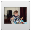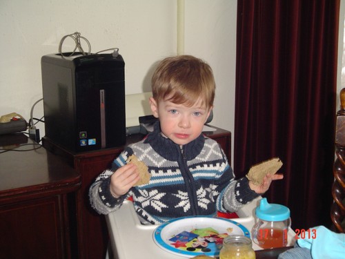 Drinken en koek halen + mijn ontbijt: "oma boteham ete, oma pillie mond, Bart ook boteham (proeft een hapje, was't lekker?) Jaa!"