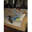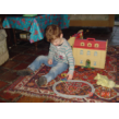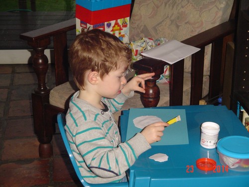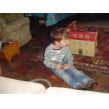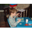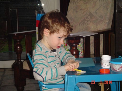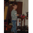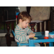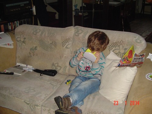 Afgelopen, waar wil je mee spelen? "Ik wiw plakke", ik pak de spullen, wat wil je maken? "sneeuwpop" en Bart gaat aan de slag. Na 10 min.: "mijn hand pakt", geeft niet, veeg maar af aan je broek, "op jouw boek, vin je lekke hè?". Genoeg van het plakken met lijm en vieze handen, nog even ogen en mond tekenen, "en een piemew", die komt onderop. "Nou is kaag". Bart drentelt weer een beetje rond en komt met volgende tip-de-muis-boek, uit, we spelen even met de race-auto. Dan ziet meneertje de letter S op de tv staan: "da is siemens, en eemshafe". Ja dat is de S. Ook weer duidelijk en Bart drentelt naar de theetafel en terug, draait aan z'n muziekdoos en kletst over de tuin en de "wewkmanne". Standaardwoord is weer "waahom?-waahom?-waahom?".