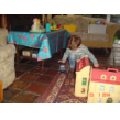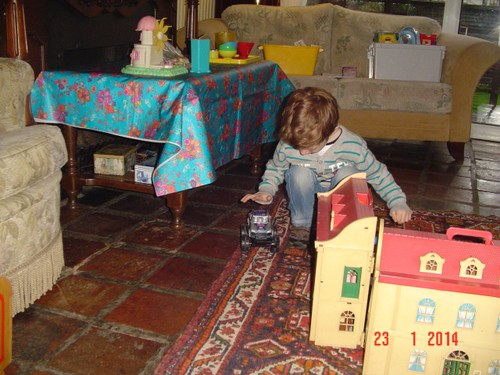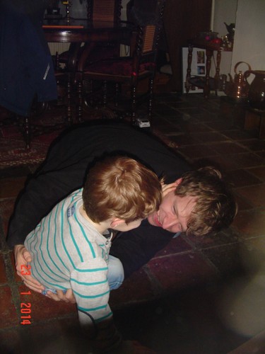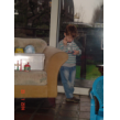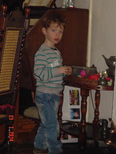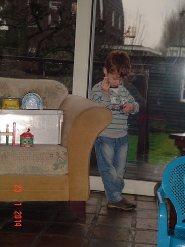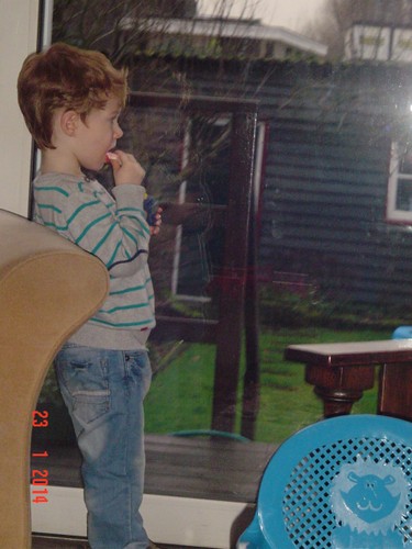 "Mijn hussak is ook nat", een watervalletje kwam naar beneden toen mama's fiets tegen de heg aankwam. Jas uit, rugzak tegen de verwarming en mama zwaaien. Dan kletsen naast me op de bank en een half uurtje boeken lezen (5 van Tip de Muis). Wil je nu wat drinken? "Nee, dat wiw ik niet", Bart geeuwt en wrijft een beetje in z'n ogen. Hmmm, we kletsen nog even verder, wat heb je op de beestenboel gedaan? "ik sing een sandkasteew bouwe, toen sing het sandkasteel wes". Hoe kon dat nou? "Sing wes", zo maar vanzelf? "Soot kindje sing wes make", ohoh dat is niet leuk, wat zei de juf? "Moest-ie naa binne". Bart vind het blijkbaar een pijnlijk onderwerp, glijdt van de bank en loopt een beetje rond. Kom maar, we gaan drinken en koek halen. Baas loopt voor me uit de keuken binnen, poes kijkt verstoord op als de deur tegen haar mand bonkt, geeft een afkeurende mauw en schrijdt met opgeheven staart naar de buitendeur. Halverwege pauzeert ze even en kijkt beledigd achterom, Bart bestudeert haar achterste: "wat sit da? sit poep in". Terug in de kamer een paar slokjes chocomel en zakje koekemannetjes op. Ondertussen kijkt hij naar teletubbies, kijkt gebiologeerd naar kindjes van een speelzaal die een spelletje doen.