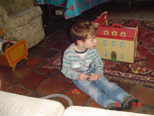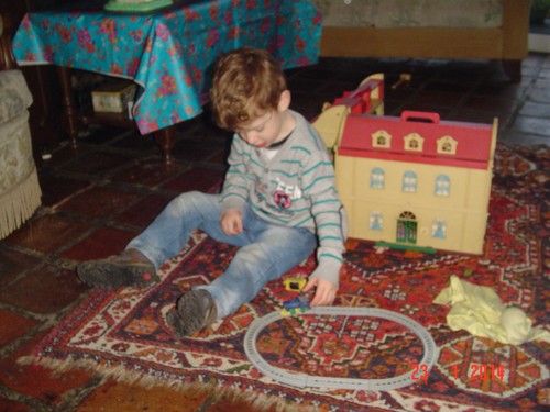 Wakker maken, ogen wrijven, niesen, aankleden. Begint al gauw te kletsen over "buuman" die zijn auto weer voor de "saasje" heeft gezet, "kunne wij niet mette auto lije". Beneden rest fruithap op, ondertussen "beesjes kijke mette vellekijke", nog wat drinken en met treintje spelen en spekje eten. Dan trekt Bart zich terug bij de theetafel, kijkt wat wazig. Wat doe? Ben je aan het poepen? Bart knikt. Ben je klaar? "Nos niet". Komt dan met een tinnen potje aanzetten: "moet je luike", ik ruik niks, "dat is teebaadjes", oh juist. Weer verder spelen met z'n treintje, ik bespeur nog geen walmpje. Eet nog een spekje en kijkt bespiegelend naar buiten: "is auto van wewkmanne, met awmaaw kleutjes".
