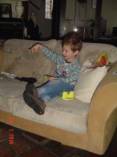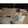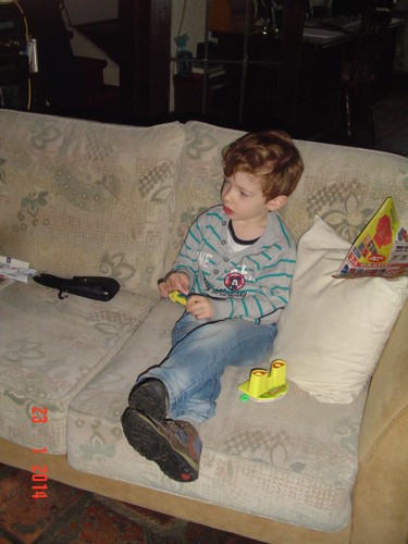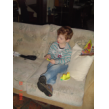 Uitpakken, spelen met opwindtrein en "beesjes kijke mette vellekijke". Als MM begint, klimt Bart op de bank, kijkt nog even in z'n vellekijke maar praat dan enthousiast mee met de aflevering over strikken. Laatste 5 min. tegen me aangeleund.