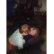 En daar is papa, in de stromende regen, "papa, papa, we lese tippemuisboek". Papa drinkt en kletst nog wat, Bart drinkt chocomel op, nog even stoeien. "Ik heb dost", water drinken in de keuken terwijl papa stoeltje op de fiets zet. Dan in de regen naar huis, regenjas aan!