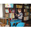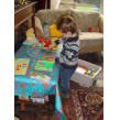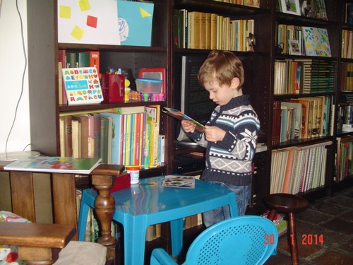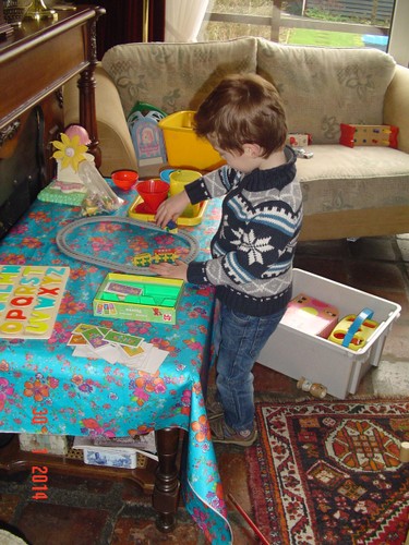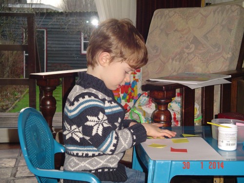 Bart komt kletsend binnen en blijft kletsen over van alles en nog wat. Mama zwaaien en even spelen met treintje, "vellekijke" en poppenhuis. Dan: "ik wiw plakke", zoekt secuur vierkantjes uit, ondertussen: "ik heb sepoept oppe beesteboew", op een potje?, "nee......... juf Linda wasse niet", waar was die dan? "inne siekehuis ...... was ziek ..... Melanie wasse ook niet ........... dan kom jij mij hale uitte beesteboew, sa ik bij jou ete", ja dat is volgende week. Na 3 stukjes geplakt te hebben: "nou is senoeg", loopt heen en weer, kletst over duif en bulldozer, speelt even met lego, kletsen-kletsen-kletsen met als standaard aan het eind van de zin "waahom?" Als ik een paar quotes wil opschrijven: "doe je? waahom?". Ik krijg geen tijd om veel te schrijven. "Nou wiw ik stikkes van Bok", ik help de stickers los te maken, na een paar minuten: "oma ik wiw niet meeg". Drentelt al orerend heen en weer en komt dan met z'n lievelingsboek, Tip de muis in de sneeuw. Samen lezen op de bank, uit, "nou dese, Tippemuis wiw niet sape". Ook uit, koek en sap halen, pomp moet ook mee, zakje koekjes op, paar slokjes drinken en dan moeten de banden van de loopauto hoognodig opgepompt.