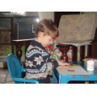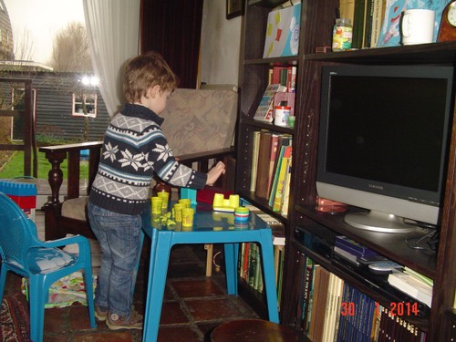 Bart is al wakker als ik z'n kamer in kom. Ben je al lang wakker? "Jaaaa", waarom heb je dan niet geroepen?, "ik sing lekke in mijn bed lisse". Aankleden en beneden rest fruithap op, tussen de happen door 'zingt' Bart mee met de liedjes. Dan gaan we verven, Bart kiest vandaag blauw papier. Kunstwerk klaar, even drogen in de boekenkast terwijl Bart met klei verder gaat. "Oma mas ik jou bakpaat hene?" Gaan we halen in de keuken, "vin poes dat ook soed? ... Vin poes mij lief? ... moete wew sasjes doen annes wod poes wakke". Verder in de kamer koekjes bakken op de plaat, "sa jij mogge bakpaat afwasse? ..... de bakkehij komt, oma wiw je een koekje?" Met een schoteltje graag, "dat heb ik niet ....nou moet je ees opete". Tijd voor een schone luier, "sietspomp ook op de bank ... is lust in jou sesicht, voew je dat?" Ik ga luier weggooien, als ik terugkom: "ik heb efe hest seset", Bart wijst naar de kandelaar op de tafel, wat heb je recht gezet? "de kaas, was een beetje seef", hoe kan dat nou?, "ik had tese aan sebonkt mette pomp, toen sing ik hecht sette". Wat goed van jou! "Efe seheedsap pakke", Bart duikt een tijdje weg achter z'n kast en komt dan terug met een tang: "oma ik heb sepoept", nee toch, "jaaaaa", grote grijns. Je hebt net een schone luier, "jaaaa". Weer verschonen en dan nog een tippemuisboek lezen tot het tijd is voor Sesamstraat, we kijken samen op de bank terwijl Bart de rest van z'n yogho drinkt.