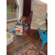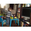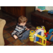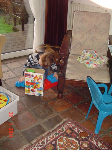 Even teletubbies kijken, Bart schatert iedere keer als hij het 'babyzonnetje' ziet. Afgelopen, Bart komt met volgende boek: "Tippemuis wiw niet naa soow", Bart drinkt z'n sap bijna op. Boek uit en ik zet muziek op, Bart gaat meebrommen, weet een hoop woordjes maar kan geen toon houden. Al 'zingend' draait hij om zijn as: "ik wod duiselis", je moet ook niet zo lang blijven draaien, dus Bart gaat dan rondjes lopen rond het poppenhuis totdat hij een "mees" op het balkon ziet, "waahom?-waahom?-waahom?" Kom maar we gaan de vogels eten geven. Brood kruimelen en touw en vetbollen pakken.