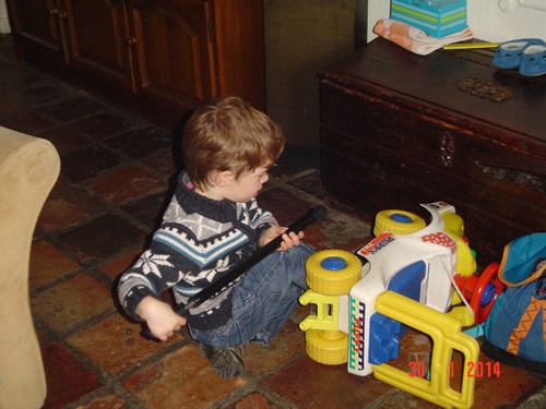"Sap is op, mas ik nos meeg?" Bart kiest chocomel en dan: "mas ik nu sessasiesasses kijke?" en installeert zich op de bank. Doet volop mee met het verhaal en drinkt in sneltreinvaart z'n pakje leeg. "Nou dese mikkie mous", nee we gaan eerst naar de zolder, ik wil kijken of er nog plaatjes voor de viewer zijn. Bart speelt een hele tijd met de 'hadio' en knikkerbaan, dan op de stoel staan en naar buiten kijken, er valt van hieruit een hele hoop te zien en daar doet baasje verslag van. Na een ½ uur naar beneden, gelijk brood smeren en eten. Dan nog even met "Bokstikkes" en trein tot het tijd is voor schone luier. Tanden poetsen en naar boven. "Saapsak past nos net ..... as het niet mee past sa ik onne de deke". Precies.