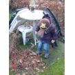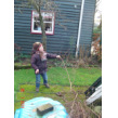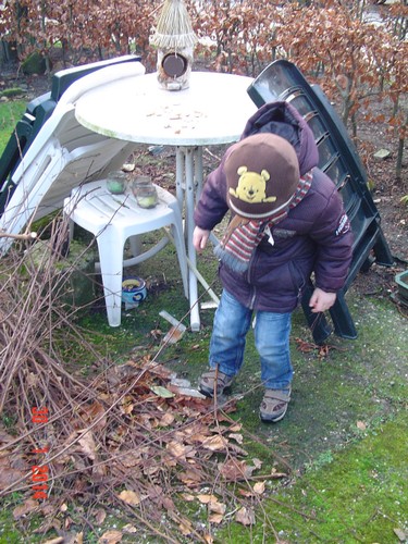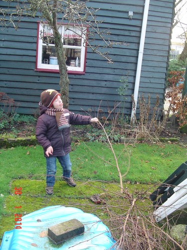 De tuin in, brood in vogelhuisjes: "moet jij mij ese optille oma", nee mannetje dat kan ik niet, leg jij maar brood op de tafel. Nog even vetbollen ophangen en dan ontdekt Bart brokken ijs die van de stoel zijn gevallen: "mas ik die kapot tappe?". Bart stampt op de ijsbrokken en zwaait met de gesnoeide takken. Ijzige wind dus als Bart vuurrode handjes heeft van de kou gaan we naar binnen.