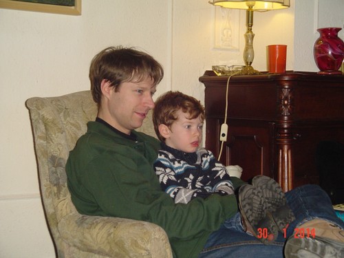 Papa is er, even sesamstraat afkijken, eerst op de bank en dan bij papa op schoot. Dan inpakken en naar huis, kunstwerken mee.