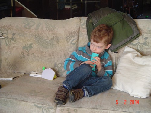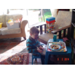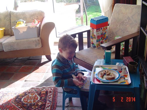 Binnen, uitpakken, "ik wiw dese kijke, sessasiesasses", nee we gaan eerst brood smeren, hoeveel boterhammen wil je? "Die" en baasje houdt 1 voor 1 z'n handen omhoog met 3 vingers. Wat wil je op je brood, worst en kaas? "Heb je nos meeg? heb je pasta?" Nee dat heb ik niet, wel pindakaas. "Omanettie wew, en wij ook". (Aha, zoet beleg dus toegestaan, onthouden omadien) Wil je melk of yogho? "Heb je chocomel?", nee da's op, "yogho", Bart is al aan het schransen terwijl ik mijn brood nog sta te smeren. Heb je honger? "JAA!"
