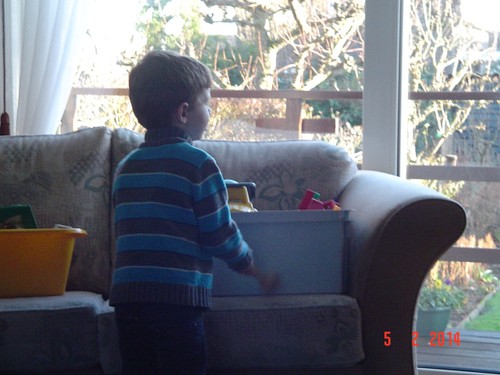 Brood op een paar korsten na op, wil je nog toet? "Nee". MM begint en Bart installeert zich op de bank met z'n yogho en 'vellekijke', zakt een beetje in en kijkt wazig en met een wit toetje naar de aflevering van minnie's logeerpartijtje, laatste stuk tegen me aangeleund. Afgelopen en Bart is weer bijgetankt, loopt naar z'n kast: "oma kan je de heels efe pakke, annes saan se los". Ik pak het treintje met de rails en Bart speelt er even mee.