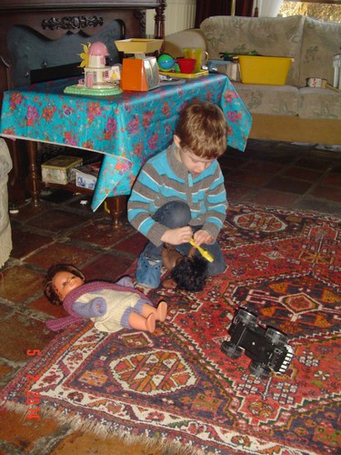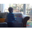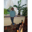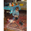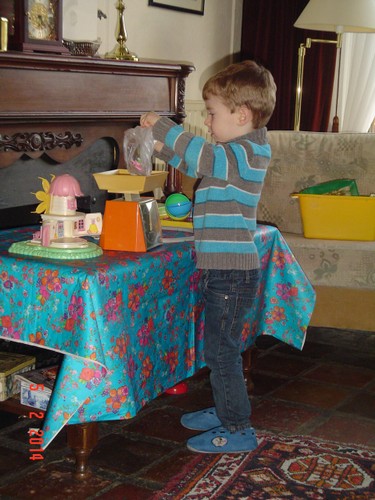 Bart komt vrolijk overeind zitten, was je al wakker? "Ja", waarom heb je me dan niet geroepen? "Ik wou nos efe lekke slape". Hmm. Gordijnen open en baasje begint te kletsen over buiten. Beneden even toet eten en nog even kletsen over beestenboel morgen en daarna vrijdag zwemmen met papa, dat is leuk hè? "Nee, was niet leuk", waarom niet? "papa mos niet innnet wate van de juf", moest je toen huilen? "jaaa, toen kwam papa innet wate", nou toen was het wel weer leuk, geen antwoord. Spelen met hamer en zaag (kam), kijken naar een meesje dat aan een vetbol hangt en kauwtjes die uit de pindakaaspot eten. Dan schone luier en tippemuisboek lezen, boek uit en ik zet muziek op, "wahom heb je da een metetje?" wijst naar de versterker. Ik krijg een idee, ik haal even een metertje voor jou, kun je kijken wat licht en zwaar is. Oude weegschaal uit de keuken, "ik sa boodsapjes wese", en haalt spulletjes van de theetafel en kijkt wat er gebeurt met het wijzertje. Dan auto's er in. Heeft het dan even gezien dus: poppehare "knippe mette tang" en "buite kijke". Dan weer verder met wegen: poppen en hamerbank: "ben mette masjiene bezis, dit is een male", een wat? "een male", wat is dat? "dat noeme ze zo, mas ik jou bakplaat lene?", heb je die nodig? "ja soo mijn keuke", verder met weegschaal. Klaar met z'n weegexperimenten en pakt een nieuw tippemuisboek.