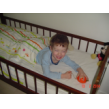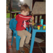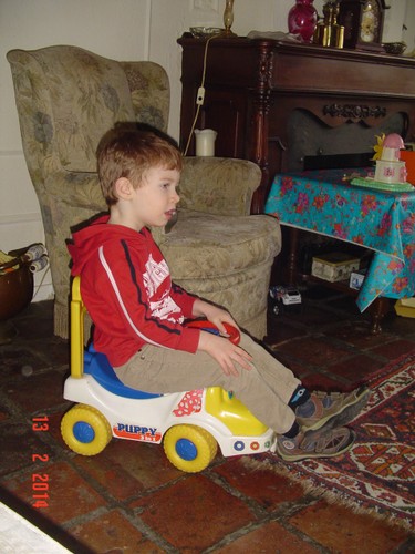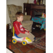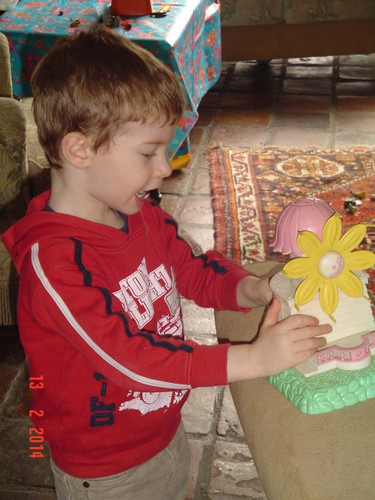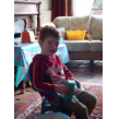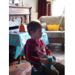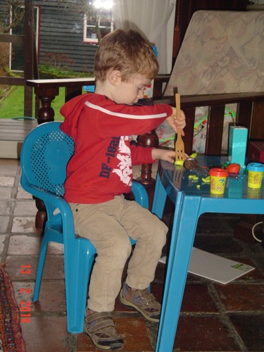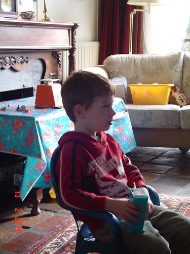 Het muziekdoosje gaat weer aan, dan is het weer stil. Na 10 min. ga ik toch maar kijken, Bart ligt nog lekker onder z'n dekbed en grijnst, begint te kletsen. Aankleden en muziekdoos op de kast leggen: "so kan Liu niet bij". Precies want Liu is nog een beetje te klein voor het muziekdoosje. Beneden staat schaatsen aan: "heb ik thuis ook sekeke, saatse". Bart gaat op z'n auto zitten en kijkt een tijdje: "zij heeft seen bil op, waahom?", weet ik niet, "sij sind bijkbaag niet lekkedeg". Dan gaat Bart met z'n klei aan de slag: "efe alles pakke", vergeet niet je chocomel te drinken, met z'n 'Bok-stem': "ja sa ik someteen doen". Bart gaat koekjes bakken, dan is schaatsen afgelopen en ik zet cd met kinderliedjes op. Ineens: "ik wiw niet die musiek" met een huilstemmetje. Wat wil je dan? Bach? "Ja bas, is dat?" Ik zet brandenburgs concert op, Bart kijkt me met een weemoedige grijns aan en springt op schoot, armen om m'n nek. Zo zitten we een paar minuten mee te wiegen op de maat van de muziek. Dan gaat Bart rechtop zitten, kijkt me met een grote grijns aan en gaat verder spelen. Ik haal een beker sap en Bart drinkt een paar slokjes, dan schone luier en opruimen. Wil je nog een boekje lezen? "Jaaa!", dan moet je eerst je chocomel en sap opdrinken, bedenk maar vast welk boek je wilt lezen. "Efe nadenke, tippemuis, ...... sap op, set beke heew hoos, kan Liu de niet bij", beker wordt in de boekenkast gepoot. Bart pakt een boek en installeert zich naast me op de bank, we lezen er 3.