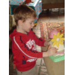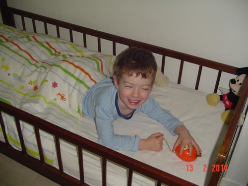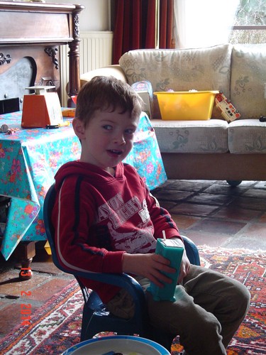 De Zeesterren zitten al aan tafel met een tosti, Bart ziet me buiten aankomen, wijst en roept. Juf Linda doet z'n tosti in een zakje om mee te nemen, Bart houdt het trots vast. Thuis gauw opeten, na ⅔: "hoef ik niet meeg, dat zijn koste, hoef ik niet", hmm, ik maak nog gauw een boterham pasta. Bart is nu een beetje stuiterig, zwaait met pollepels, nu eerst boterham eten Bart anders kijken we geen MM. Het werkt weer, boterham op en Bart gaat met molenhuis spelen.
