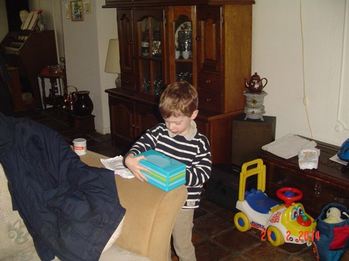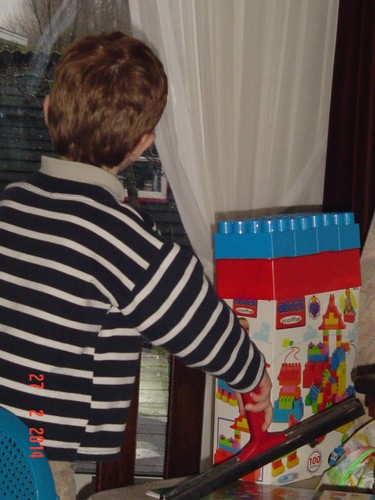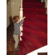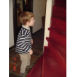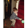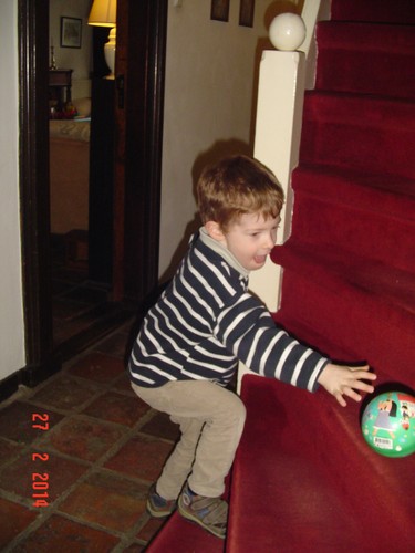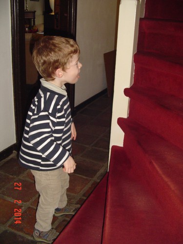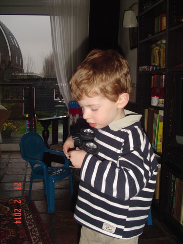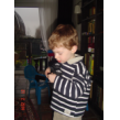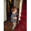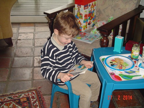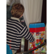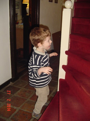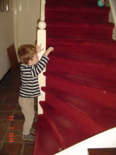 Bart slaapt nog, wordt met moeite wakker, blijft een beetje groggy als we de trap aflopen. Beneden nog even bijkomen dus en ik wil de cd kinderliedjes opzetten maar: "ik wiw seen musiek, niet die", deze dan, met een fluit. Panfluit cd op, Bart luistert naar de eerste tonen en springt dan op schoot, springt er weer af, pakt pop en weer op schoot, klemt zich aan me vast, duwt z'n toet tegen m'n hals, we wiegen mee met de muziek. Na 10 min. gaat hij rechtop zitten, lacht een beetje weemoedig en gaat z'n chocomel opdrinken. Wil je nu voetballen? "nee, ees schone luie", is je luier nat? wil je op het potje?, "nee" en hij gaat de verschoonspullen klaarzetten. Klaar en spelen: eerst klei, dan ramen zemen, race-auto repareren en nieuwe stempels met letters uitproberen. Genoeg gezeten, dus voetballen in de gang en bal zo hoog mogelijk de trap opgooien. Als het ding op een tree blijft liggen, wil Bart natuurlijk omhoog klimmen, neenee, niet op de trap, "jij moet efe pakke oma". Bart gooit, rent achter de stuiterende bal aan en heeft lol. Dan in de kamer even wat koekemannetjes eten en sap drinken, ondertussen 'verstoppen' achter de bank. Ik pak het sesamstraat domino-spel en Bart gaat "sefde paatjes" aan elkaar leggen. Sommige plaatjes hebben minieme verschillen maar Bart legt de goede plaatjes tegen elkaar, goed zo!