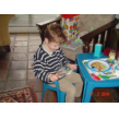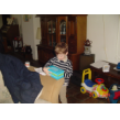 Thuis, gauw eten en MM kijken en nog even spelen: nog een keer proberen de race-auto te repareren met gereedschap, poef wordt weer aangesleept en een tijdje eraf springen, rollen op het kleed. Genoeg gym gedaan, we gaan zo naar boven Bart, "ik wiw niet slape, ik ben niet moe", strakjes ga je even slapen, "nee ik wiw niet slape", hoeft ook niet, gebeurt toch, anders ben je vanmiddag te moe om verder te spelen. Bart gaat voetballen in de gang en ik ga opruimen: "OMA!! kom es", nee ik ben aan het opruimen. Eetspullen opgeruimd, wil je nog op de po?, "nee ik wiw niet oppe po", ook goed, dan gaan we schone luier aan doen, leg je de spullen even klaar? Bart stopt met ballen en helpt met "billedoekjes... en sawf... en handdoek", goed zo.