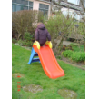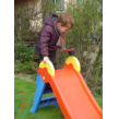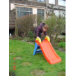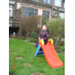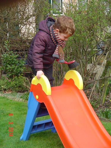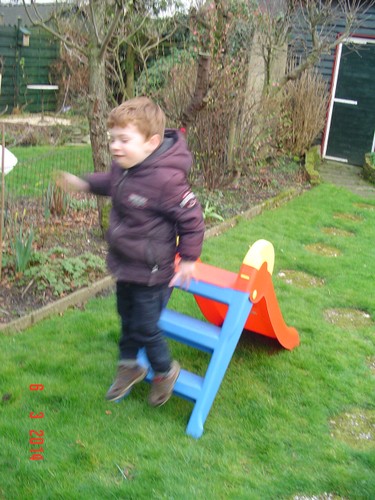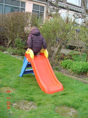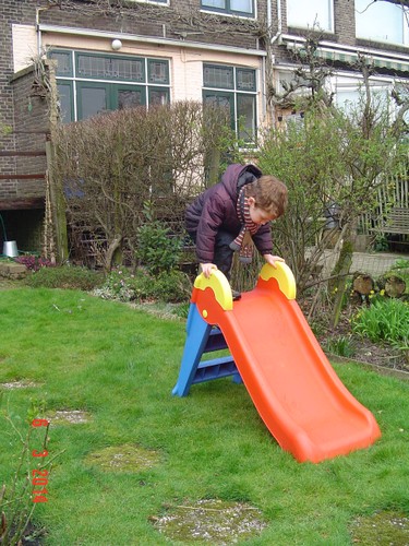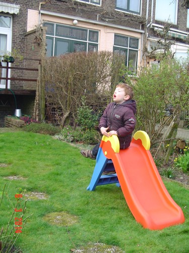 Zeesterren zitten al aan tafel, jufs smeren brood. Bart drinkt nog wat van z'n beker sap, krijgt een plakje komkommer mee en kruipt dan onder de tafel door naar me toe. Onderweg in de auto eet hij z'n zuinig bewaarde plakje komkommer en kletst: "wijzes zijn hood" (stoplicht), heimachine, zie je dat? autoos op de staat, strrrrrraat". Ineens hoor ik hem een beetje vals zingen: "en de bloemetjes laten staan. . Da is hoosvliet, hooggggvliet". Thuis: "ik kan in de tuin, is mooi wee joh!" Direkt naar de glijbaan, klimmen en glijden. Probeert tegen de gladde kant op te kruipen, doe dat maar niet, dan kun je uitglijden. Bart probeert het toch en boem, op z'n buik, "au", kijkt me aan en ik trek m'n schouders op.. tja dat is het risico. Doet dat dus niet meer. Even de glijbaan schoonvegen en dan haal ik de boenwas en smeer de glijbaan in, nu is die lekker glad en Bart roetst naar beneden, komt met z'n billen op het gras: "au, doet pijn aan mijn billen". Echt niet, gras is niet hard, Bart glijdt nog een keer naar beneden: "au, daa", wijst billen aan en komt naar me toe, even wrijven dan. Da's geen pijn, dat voel je maar da's geen au, da's een bons en daar zijn je billen voor. Ik wijs hem hoe hij dan even over z'n billen moet wrijven: zo moet je dan even doen en dan glijdt Bart onvermoeibaar door. Is nu gewend aan de "bons".