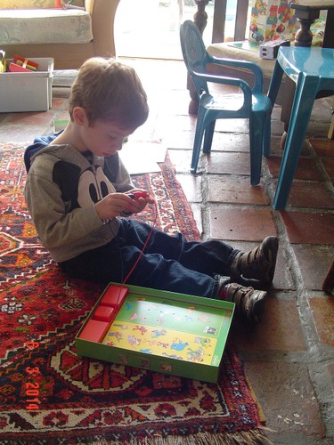 Wordt met heel veel moeite wakker, ja dat was te verwachten: heeft zich lang verzet tegen de slaap. Krabbelt dan toch maar overeind, rustig aankleden en dan gaat hij een tijdje dromerig voor het raam naar buiten kijken: "eende zijn niet in de vijve, tee pappesaaitjes in de boom, zie je dat? ik zie seen wewkauto, wom?". Dan naar beneden, direct met electro aan de slag. Hij is niet geïnteresseerd in het zoeken van de gelijke plaatjes, maar weet van 2 plaatjes hoe hij het lampje moet laten branden en daar gaat het om nietwaar? Dus: plaatjes aanprikken, lampje brandt, knopje op uit, knopje op aan, plaatjes aanprikken, lampje brandt, "so, nou efe uit" en gaat verder met abc-puzzel: "buh, ah, is dat?". We maken van de letters zijn naam, Bart legt de letters terug: "puh van pino, die is van mama, pootjes naa benede, wom heeft deze pootjes naa bofe?", dat is de wuh, "wom?". Even sap maken, maar baas wil niet drinken of koekemannetjes eten: "nu wiw ik in de tuin".