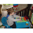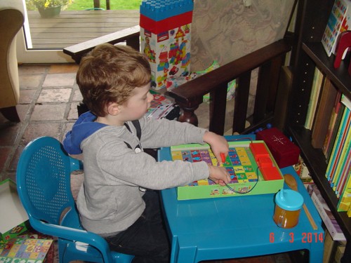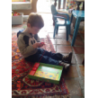 Daar is papa, even glijden en springen showen en dan kunnen we gelukkig naar binnen. Papa drinkt nog wat en Bart showt z'n kunsten met het lampje van electro en letters van de abc-puzzel. Dan inpakken.