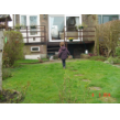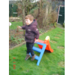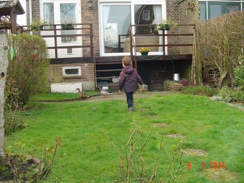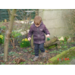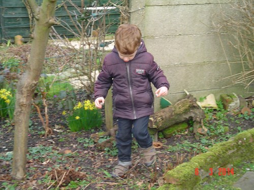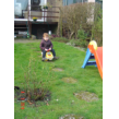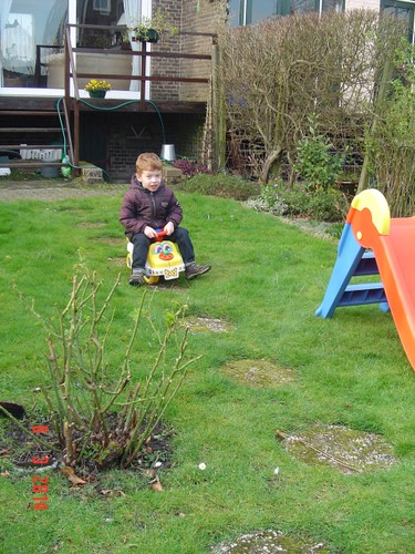 Drinken etc. mee en naar buiten, Bart is druk met glijbaan, lege slakkehuisjes zoeken, zandbak, duiven en "papesaaitjes" kijken, "wom?-wom?-wom?" en af en toe een slok sap. Vindt dan nieuwe truc uit: springen van de onderste tree van de glijbaan, na een paar keer oefenen, lukt dat met 2 voeten tegelijk en rolt om in het gras en belandt weer op z'n billen: "au pijn", niks hoor, is geen pijn, da's een bons, moet je even wrijven weet je nog? Bart springt keer op keer van de onderste tree en roept triomfantelijk: "ik sing hoos hè oma? zas je dat?". Geweldig Bart, dat was een hoge sprong!! Baasje blijft springen, 1 keer vraag ik hoopvol of we naar binnen zullen gaan, zon is weg en er waait een koude wind dus ik zit te kleumen. Noppes: "nee ik wiw spinge", dan ga ik maar even een bloempot opruimen.