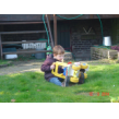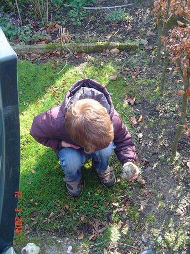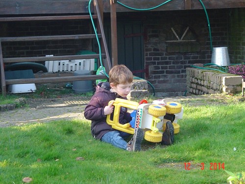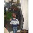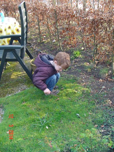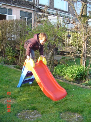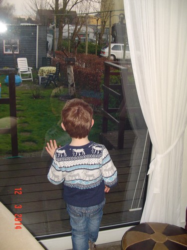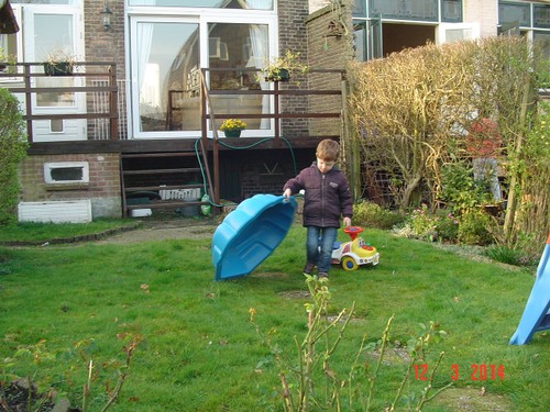 Bart staat al te wachten bij de deur van de kikkers, ik loop naar binnen en dan gaat hij weer braaf aan tafel zitten om z'n melk op te drinken. Linda: dat mag je ook laten staan hoor Bart, je mag gelijk met oma mee. Bart rent weer naar me toe en we zeggen gedag. In de gang: "is mooi weer joh, sonnetje sijnt, kan ik in jou tuin". Jas aan, waar is je helm? "Helm isse niet", neemt papa of mama zeker mee, "misschien komt mama mij hale . . of papa", hangt ervan af hoe laat papa thuis is, "ik denk 5 over half uur". Onderweg: 1e stoplicht is rood, duurt lang, hèhè, groen eindelijk, "ben je blij dat het soen is oma? . . da is papa-mama-strrrrraat . . heimachine is weg . . ben je blij dat we dit padje rrrrrijde?"