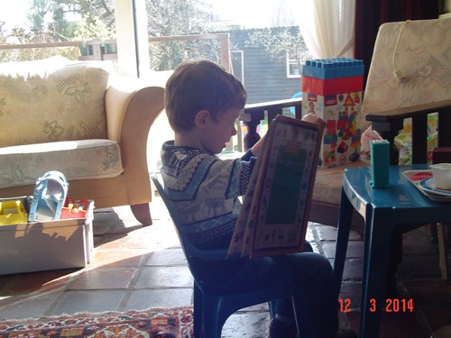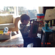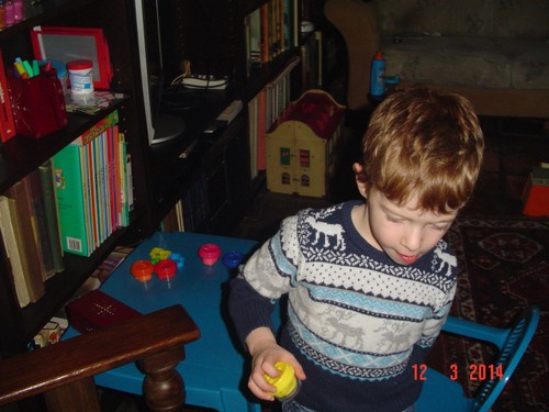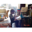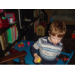 Naar binnen en samen sesamstraat kijken, daarna in de keuken eten afmaken en in de kamer nog even met klei spelen. Na een uurtje is mama er, Bart wil nog even "musiek make" aan mama laten zien en dan gauw inpakken en naar huis.
