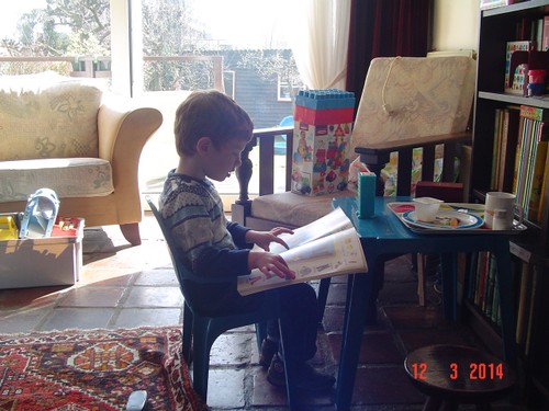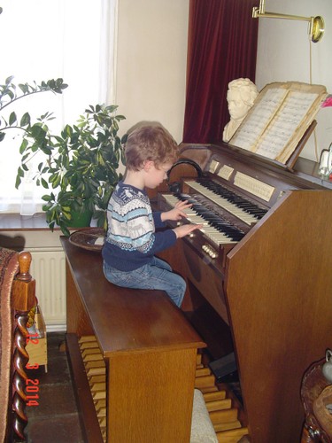 Thuis, "lekke in jou tuin joh!", wil je niet eerst naar binnen?, "NEEE", heb je nog geen honger? "NEEEE ik heb seen honge". Bart drentelt een tijdje wat heen en weer, dan: "ik wiw binne spele". Gauw brood smeren, en eten: "beebietje in tante Amalia's buik is stuk sesaan, is mis sesaan, sebeut soms". Daarna wordt baas een beetje stuiterig, schopt tegen de tafel, wipt met z'n stoel, gaat steeds staan. Even ingrijpen: welk boek wil je lezen? "dese, beewtje peddington", Bart kalmeert, leest z'n boek en eet z'n bord leeg, "nu wiw ik sessasiesasses kijke", blijft 10 min. zitten en drinkt z'n chocomel op. Dan begint hij weer te stuiteren, loopt rond, even zitten, ronddraaien op het kleed en zich laten vallen, op de stoel zitten, weer springen, op de bank zitten. Dvd afgelopen: "nu wiw ik ook musiek make", loopt naar de orgelbank, kwakt tekenpapier en kleed op de grond. Vooruit dan maar, nog even, en Bart bewerkt met volle overgave de toetsen, kijkt af en toe naar de bladmuziek . . "dese bladsij is asselope, moet je omdaaie oma", ik sla een bladzij om en Bart speelt verder: "dese liedje is ook asselope, wee efe omdaaie oma". Na een kwartier vind ik het tijd voor een schone luier, dan naar de keuken opruimen en tanden poetsen, Bart kwakt de deur tegen de poesemand, zachtjes Bart!!!!, "efe poes aaie, van kop naa staat". Nu nog even pop en hond pakken, hij rent weer voor me uit en knipt de schemerlamp boven z'n rugzak aan, dat mag niet!!! (pruillip) nee da's gevaarlijk, daar mag je niet aankomen. Dan rustig naar boven en uitkleden, kruip er maar onder, "ik moet nos pyama aan", nee da's te warm, dat hadden we vorige week afgesproken, weet je nog? "dan kijs ik koude bene", nee hoor, je dekbed is warm genoeg. Weer een pruillip en een snikje, duwt z'n hoofd tegen hond aan, ik doe gordijnen dicht. Nou lekker liggen, doe je muziekje maar aan, "as jij wes bent", knuffel en stuiterballetje ligt nu rustig. Ik hoor nog 1x muziekje aan gaan.