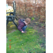 Bart slaapt nog, wordt langzaam wakker. Beneden blijft hij wat hangerig, wil niks, niet drinken, geen koekje, niet spelen, geen boekje, tijdje op schoot. Na een tijdje gaan we samen eten koken, "kan ik jou helpe oma". Bart komt wat bij, geeft de spullen aan, gooit dingen weg en smikkelt een plakje ham. Dan gaan we naar buiten, beetje springen, rijden, heen en weer lopen, mos uit gras plukken en met deksel van zandbak sjouwen. Tussendoor steeds even op schoot en een paar slokjes drinken.