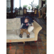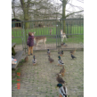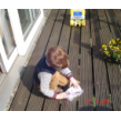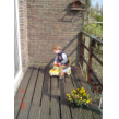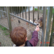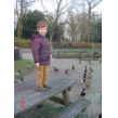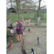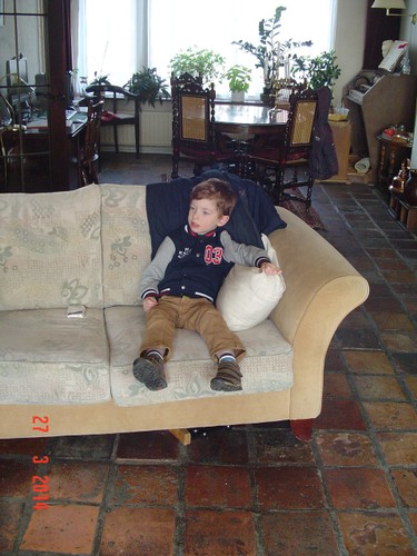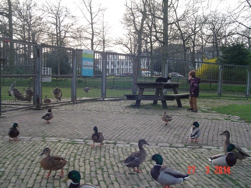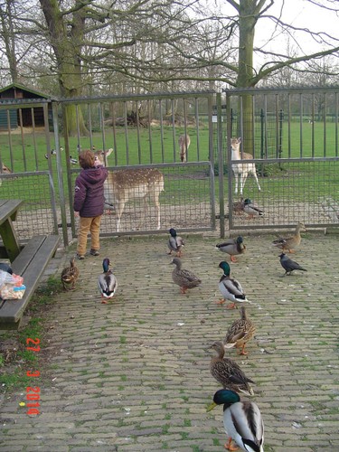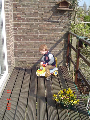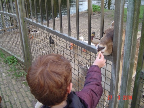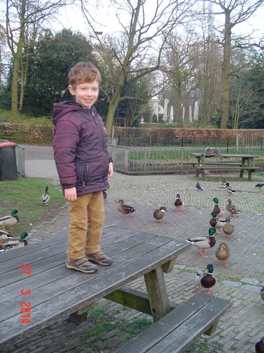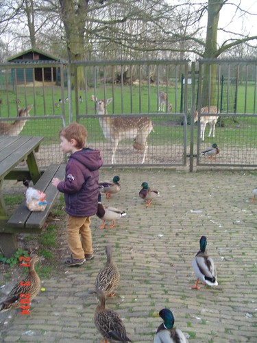 Bart ligt nog te doezelen, rustig aankleden en dan voor het raam de "hooswehkes" achter bespreken. Beneden drentelt Bart wat door de kamer, komt bij me staan: "saan we naa het parrk?", eerst even je yogho opdrinken. Hmmm, da's duidelijk een tegenvaller en meneertje hervat z'n gedrentel door de kamer. Na een paar minuten komt hij toch maar naast me zitten en begint te drinken, na 10 min. is het pakje leeg en gaan we brood kruimelen in de keuken. Dan naar de auto, bij het park staat een hakselaar met veel lawaai takken te vermalen. We parkeren een eindje verder, daar is het lawaai iets minder en Bart staat het apparaat een tijdje te bewonderen: "die wiw ik ook, voo mijn vuhjaadag", dat moet je maar even aan papa vragen. Dan het park in, eenden brood geven. Als die een beetje al te opdringerig worden en naar de stukjes brood happen, wordt Bart een beetje pieperig: "ze happe in mijn hande". Geef dat hert maar brood, die hapt niet. Baasje geeft voorzichtig stukjes brood en vertelt glunderend: " hegt sing rrruike aan mijn hand, zag je dat?" Krijgt dan de 'restaurantpoes' in de gaten, rent er naar toe "hai poes!". Laatste stukjes brood aan de herten, hij vindt de happende eenden maar niks, klimt dus boven op een bank. Kom maar dan gaan we boten kijken, we gaan op weg naar de Vliet. "Ik heb een steentje in mijn soen", bij een bankje klop ik z'n schoenen uit, geen steentjes, hmm, en er zijn ook geen boten te zien: "zijn seen bote!". Even verder begint Bart te jengelen: "ik wiw daa naa het pallek, naa die pallek". Daar gaan we ook naar toe, maar dan moeten we wel hierlangs lopen. Bart maakt huilgeluiden, maar produceert geen traantjes, ik probeer hem zo goed mogelijk af te leiden door muziektent, stokken, narcissen aan te wijzen. Het helpt maar half. Dan zijn we terug bij de dieren, Bart klimt op een tafel en ik help hem eraf springen, steeds weer, en Bart geniet, geen spoor meer van gemekker. Dan hoor ik de kerkklok 5 uur slaan, oei, gauw naar huis Bart, papa komt je zo halen. Op het bruggetje ziet Bart in de verte een grote boot varen en rent de brug af: "kom oma, daa is een boot, kom kijke!!". Neenee, als we bij het water zijn, is de boot al lang weg, kijk es hoe hard hij vaart. Kom maar op het randje van de brug staan dan kun je het ook goed zien. Als de boot weg is: "ik wiw naa huis, kom naa de auto". Bart zakt ineens weer in en in de auto zit hij weer met een wit bekkie achterovergeleund.