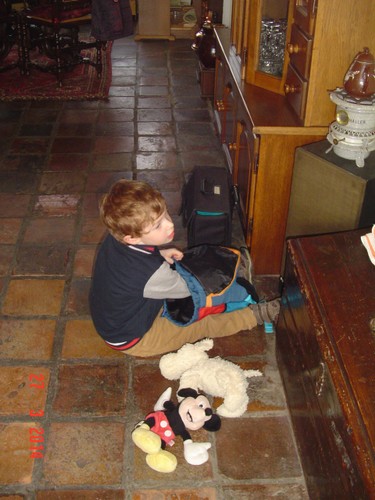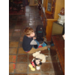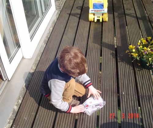 We rijden het biggepad in, voor het huis staat papa al op het fietspad op het punt om over te steken, zodra Bart dat ziet: "papa, ik zit nos in de auto!". Auto in de garage en dan naar binnen, nog even wat drinken, Bart slobbert wat sap. Wordt dan een beetje stuiterig: "ik wiw muziek make", volgende week weer, we gaan zo naar huis. Daar is meneertje het niet mee eens en begint de wegpuzzel uit elkaar te halen: "deze stuk make". Hoogste tijd om in te pakken!