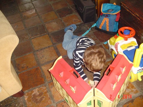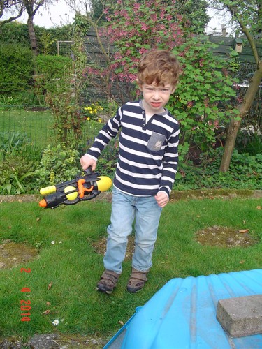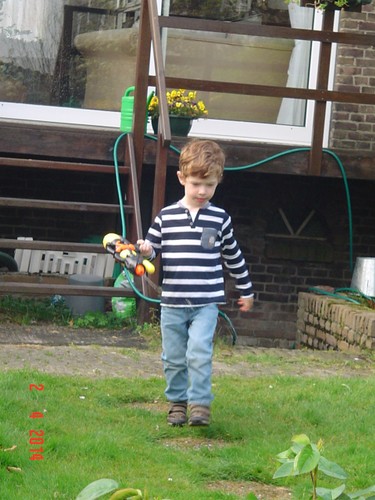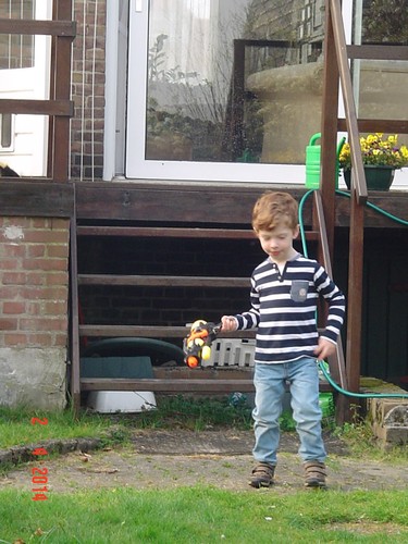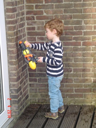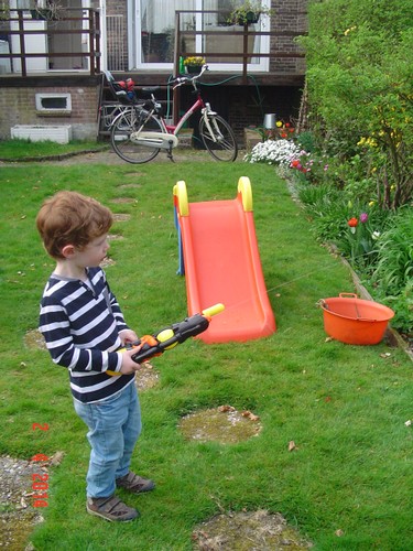 Eerst schoenen en sokken uitkloppen op balkon, Bart giechelt als ik z'n voeten afveeg, dan naar binnen. MM is al begonnen, we kunnen net de laatste 10 min. zien. Gauw brood smeren: "mag ik al ete?", ja hoor, heb je zo'n honger?, (met volle mond): "jaaa". Als ik het dienblad meeneem naar de kamer is z'n bord al half leeg! Beetje kletsen over de beestenboel en ik vertel dat we na z'n slaapje een nieuw waterpistool gaan halen bij Zeeman, "jaaaa, en dan kan ik in de drraaimole", ja, maar dan moet je nu wel je yogho half opdrinken en straks de rest (pure blackmail maar het werkt wel). Welke kleur wil je? "een rrode", ik weet niet of ze die hebben, we kiezen wel een mooie uit.Tijdens laatste hapjes brood gaat Bart weer zitten schoppen, niet doen! straks verslik je je nog. Te laat, er schiet een broodkruimel in z'n keel en Bart hoest het er weer uit, rechteroog traant ervan. Zie je nou wel? Als je niet rustig zit, kun je je verslikken en nu heb je tranen in je oog. Bart kijkt me een beetje beledigd aan, wrijft de tranen uit z'n oog maar zit verder wel stil. Eet verder rustig yoghurthap en halve fruithap en drinkt plichtsgetrouw een paar slokjes yogho en verkondigt: "dat is half op", nee hoor, echt niet, nog even doordrinken. Bart kijkt me even aan en drinkt verder, goed zo, nou is het half op! "Hèhè! . . . nou ga ik efe spele", da's goed, nog even. Ik ga opruimen en Bart gaat aan de slag met poppenhuis, electro en blokkenkoffer. Dan schone luier: hé er zit een plasje in je luier, "jaaa, is luie van de beesteboel, met drraakjes, mamadrraak en bebiedrraak .. . . nou efe weggggooie". Gelijk maar tanden poetsen en: ga hond en pop maar even pakken, "OK!"