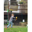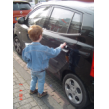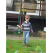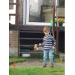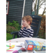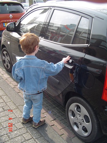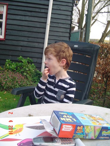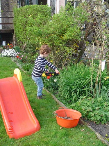 Alles speelt op het binnenplein, lekker buiten. Juf Linda doet het hek voor me open, Bart zit met een bups peuters in het speelhuis. Als hij me ziet, wijst hij en roept naar Maurits: "da is mijn papa!", juffen schieten in de lach en Bart corrigeert zichzelf direct: "da is mijn oma!" en komt naar buiten geklauterd. Begint direct met hele verhalen: "mijn soene zijn vol zand, moet je eve uitkloppe", ja straks, "en ... en toen ..... en ....", even dag zeggen, pakt mijn hand en begeleidt mij naar binnen. "Kijk oma, kom es kijke, da's voo pase". Er staat een paasboom in de klas van de kikkers, "in mijn klas ook, kom maar kijke", rent voor me uit naar z'n eigen klas waar ik een nog grotere boom bewonder, "niet bij de bebies", nee dat denk ik ook niet. Naar de kapstok: "ik heb spijkejas, net als papa". Waar is je tas? "hie in dese kast", en je helm? "heeft mama meesenome". Naar de auto, tot het hek wil Bart persé z'n luiertas dragen: "ik ben heeeel sterrrk". Daar wordt het blijkbaar toch te zwaar want hij zet hem neer en ik mag hem verder dragen. Onderweg worden natuurlijk weer de bomen, bloemen, putten en watervogels besproken. We rijden weg: "je rrijdt op fietspad", nee hoor, dat is naast de weg, "politiemotofiets . . zie je dat? met koffetje achterrop, wom?" Weet ik niet, (ik denk aan handboeien maar zeg dat maar niet, het is te druk op de weg om een verhandeling over boeven etc. te houden), "ik denk betespulle, kan die mense bete make". Oh, ik dacht dat een ambulance dat doet, "politie doet dat ook". Weer wat geleerd. "Da is benzine . . . da is tankauto leessemaakt", heb je dat gezien? "ja met mama . . . . . jouw auto maakt herrie", vind je dat? "ja dat vind ik. . BUS! saat die heen?" naar Leiden, "nos een bus . . twee busse, da's gappig". Bij de kerkbrug: "is rrrood . . waahom fietse die mense doorrr?" hebben zeker haast, "wom hebbe ze haast?", misschien hebben ze zich verslapen, "whom?", weet ik niet, het mag in ieder geval niet, als de politie het ziet, krijgen ze een bekeuring. Daar moet Bart een tijdje over sudderen dus de vraag 'is-dat' komt niet want dan zijn we thuis.