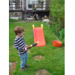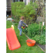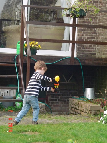 Papa is er. Die weet de blokkering van de trekker weg te halen, dus nu kan Bart langere tijd spuiten. We drinken nog wat en papa vult het pistool steeds weer bij met de plantengieter.