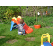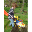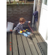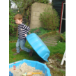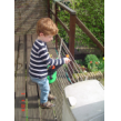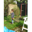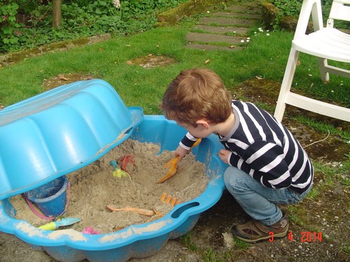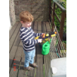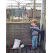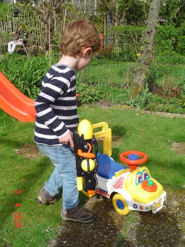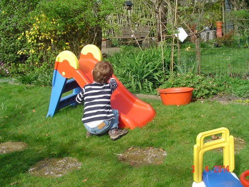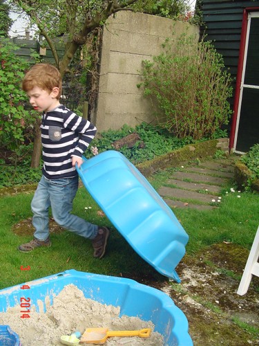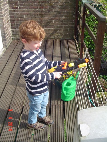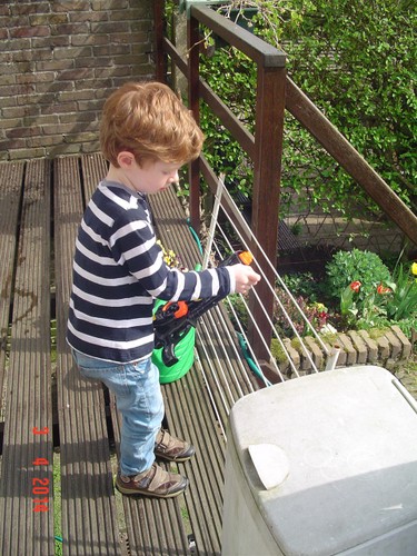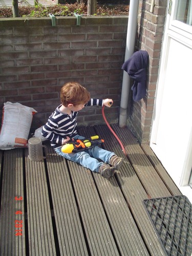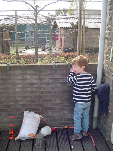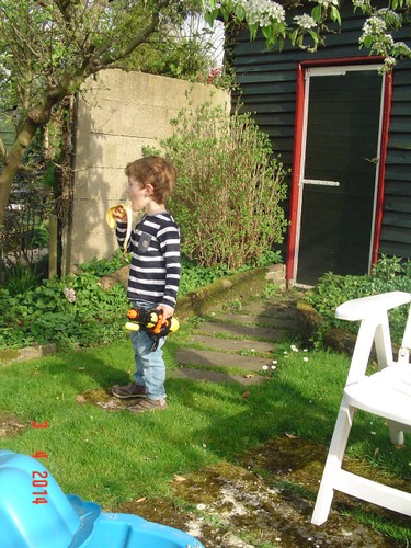 Muziekje gaat aan, gauw kijken. Baasje zit rechtop in z'n bed, wil je niet meer slapen? "neee", grote grijns, dus aankleden, net als gister wijst hij me op het gaatje in z'n nieuwe trui, steekt z'n vinger erdoor: "was nieuwe trui en nou istie stuk, zit ghaatje in". Zal ik straks echt even maken, niet aankomen want dan maak je het gaatje groter. Even voor het raam: "das een bouw-wc, da doen bouwmeneerre plasjes en poepies in", hebben die geen luiers dan? "nee, tuulijk niet". Beneden even chocomel opdrinken en dan spullen verzamelen om de tuin in te gaan, Bart pakt alvast z'n spuit die ik eerst moet vullen en gaat alvast naar het balkon, "hoo ik?", iemand is het kippenhok bij de buren aan het schoonspuiten en Bart kijkt over de rand van de muur. Met koekjes, sap en naaispullen naar de tuin. Baasje is bezig met z'n waterpistool, sjouwt met glijbaan en loopauto en "hoo ik? hoo ik?" da's een vliegtuig, Bart kijkt omhoog en wijst: "daa is vliegtuig". Glijbaan heeft hij inmiddels verplaatst: kijkes oma, slijbaan heb ik hie gezet!" Prima! daar kun je er ook goed vanaf glijden, sjouwen met grote spullen vindt hij prachtig. Dan drinkt hij sap op en eet zak koekemannetjes leeg terwijl ik even het gaatje in z'n trui dichtnaai. Trui weer aan en ik ga zevenblad uit de border halen, rotklus dus af en toe zeg ik pfff. Bart vraagt "wom zeghg je dat?", zit heel vast, is dus best zwaar om eruit te trekken. Bart plukt ondertussen hoog gras, gooit dat ook in de emmer en troost me: "is ook zwaarr, maa ik ben sterrk". Dan prik ik me aan een voorjaarsbrandneteltje, oei, rode vingers dus azaron pakken want weegbree is er nog niet. Bart: "als je weer prrikt moet je efe zegge teghge mij . . zal je dat onthoude?", ja dank je, dat zal ik doen. Verder samen in de tuin bezig, tussendoor spuit hij af en toe met z'n pistool. Z'n handen zijn groen van het gras plukken.