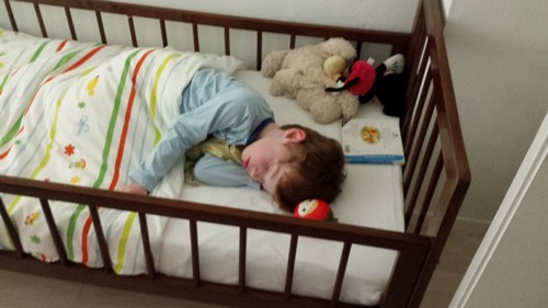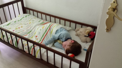 Ik hoor af en toe gebonk, stukje onrust slaapt nog niet. Na 10 min. gaat ineens het muziekje aan en ik ga naar boven. Bart zit rechtop in z'n bed bovenop z'n dekbed. Eerst even slapen mannetje, dan mag je eruit, "ik wil onder de deken". Ik dek hem toe, doe muziekje aan en daarna blijft het stil.
