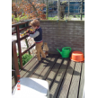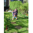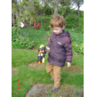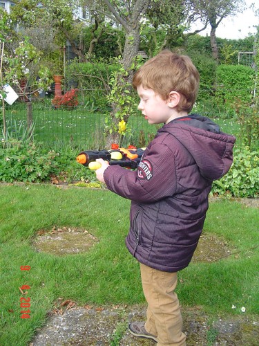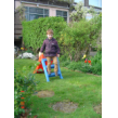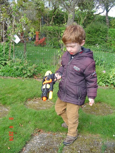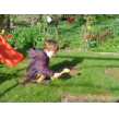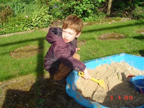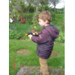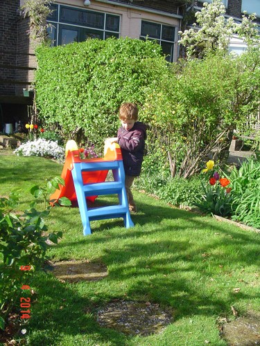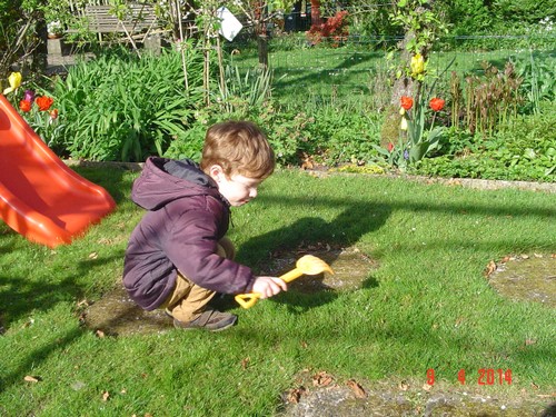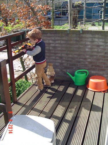 Ja dat dacht ik wel, nog diep in slaap. Rustig wakker maken en aankleden. Beneden op de bank even bijkomen en een beetje kletsen over het wielrennen op de tv. Na 20 min. drinkt hij een beetje chocomel en eet een koekje. Er is nu geen tijd meer om naar het park te gaan, "we kunne wel naa buite" stelt Bart voor, goed idee, gaan we gelijk even mijn containers zoeken (die zijn door de buren weer eens ergens achter neergezet). 1 container vinden we, de groene blijft zoek. We gaan de tuin maar in en Bart gaat spelen. Als de buurman langs loopt, vraag ik hem naar de groene bak, hij gaat ook zoeken maar het ding blijft onvindbaar en zijn personeel dat de containers altijd verzamelt, is al weg. Ter compensatie krijg ik een oude bak zonder deksel, Bart heeft alles nauwgezet gevolgd: "ben je nou blij oma?", nou! "is zonde deksel, ben je blij?", ja hoor, "ben je echt blij?". Bart vindt het duidelijk twijfelachtig dat je met een kapotte bak blij kunt zijn, drinkt nog wat chocomel, eet koekjes en speelt verder met zandbak, glijbaan en waterpistool.